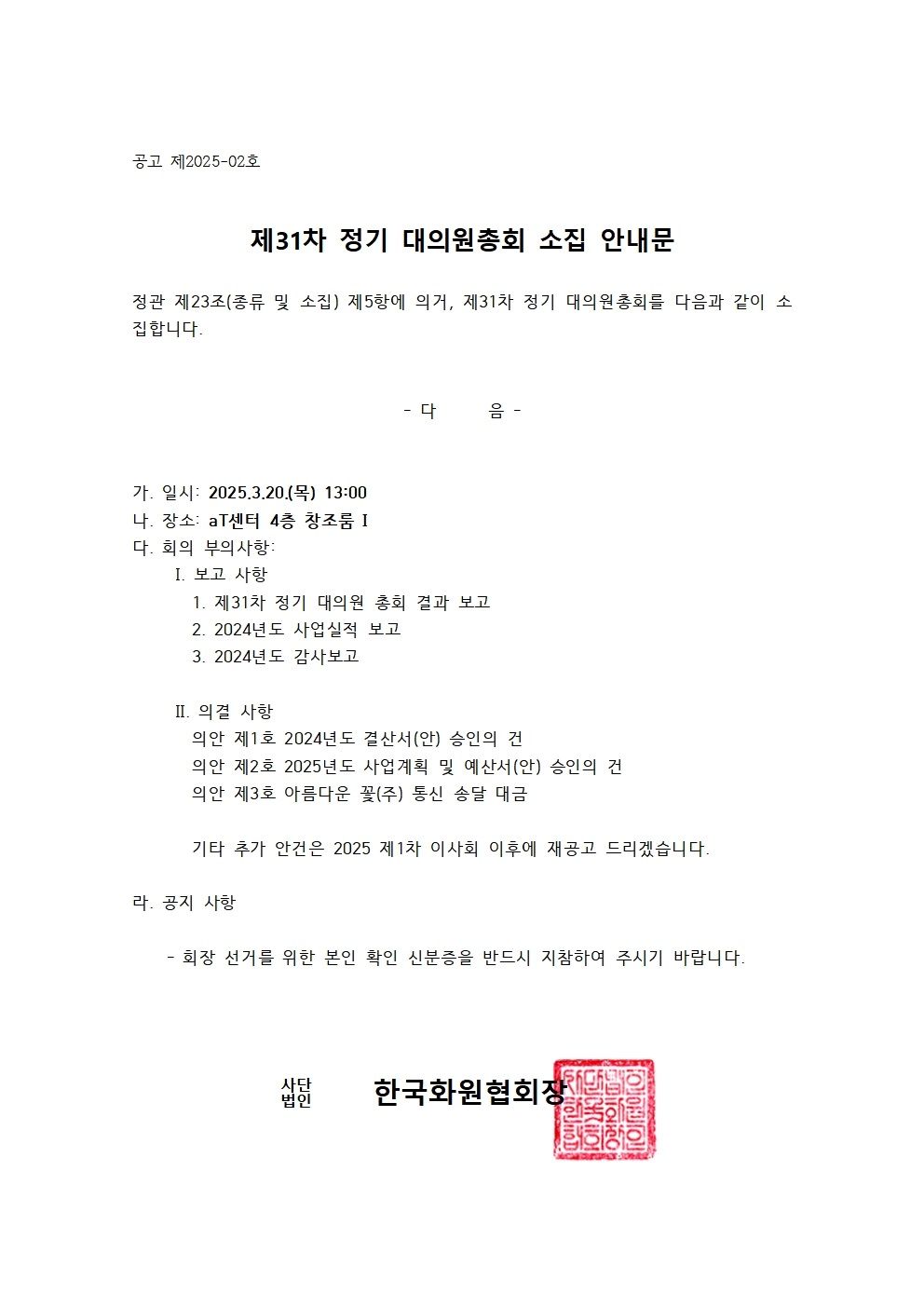 [공고] 2025 제 31차 정기 대의원 총회 소집 안내문