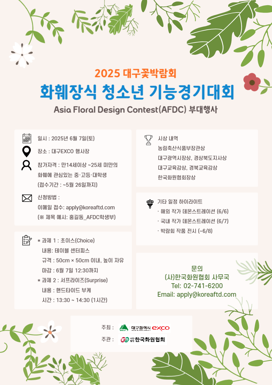 6월7일에 진행되는 화훼장식 청소년 기능경기대회에 참가할 학생을 모집합니다.