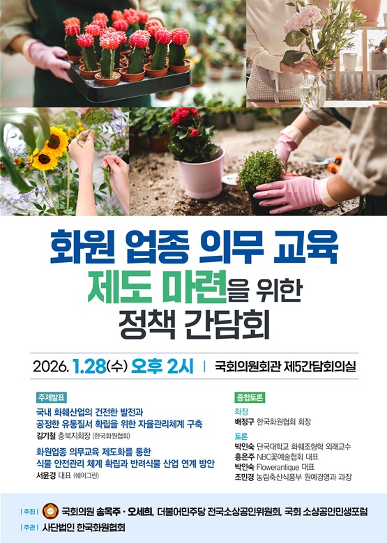 2026년 화원협회가 화훼업계를 위한 활동의 일환으로 정책간담회를 개최하오니 많은 관심과 참여 부탁 드립니다.